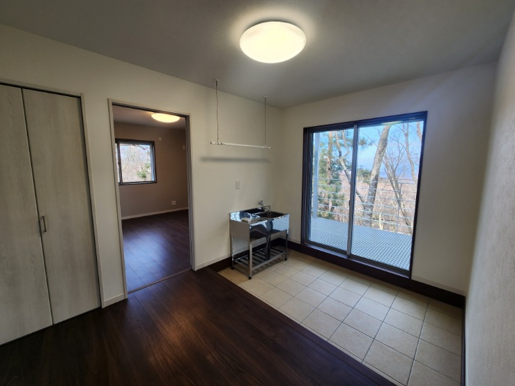1階のデッキへ出るフリースペース シンクで洗った雑巾などを室内にも干せます。