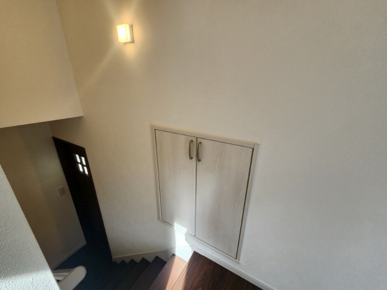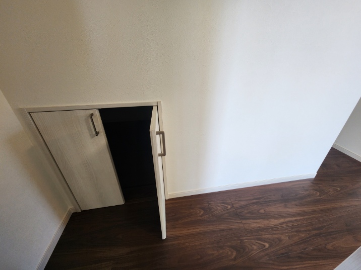 玄関をすっきりさせるために壁の中に収めた下駄箱