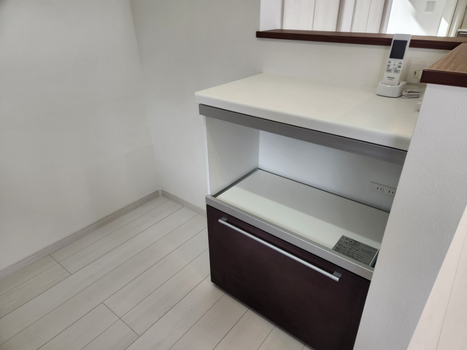 お別荘なので、家電が置けて下にゴミ箱を入れる収納のみを設置しました。