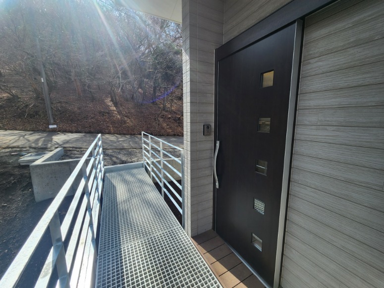 玄関から駐車スペースまではグレーチングの通路で渡ります