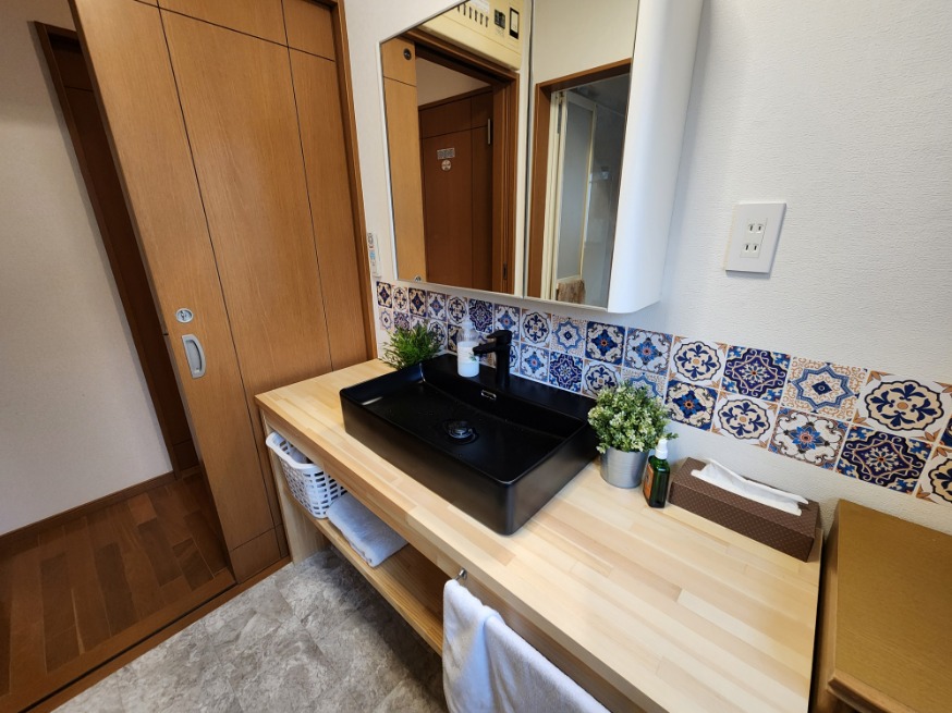 既存洗面台撤去、造作カウンター設置、鏡設置、床のクッションフロア貼替